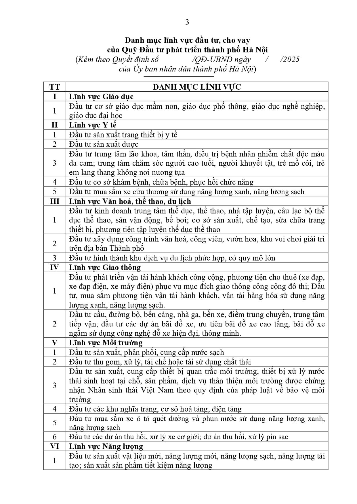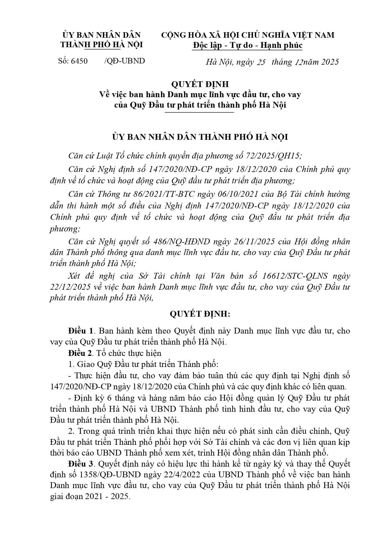 Quyết định về việc ban hành Danh mục lĩnh vực đầu tư, cho vay của Quỹ Đầu tư phát triển thành phố Hà Nội