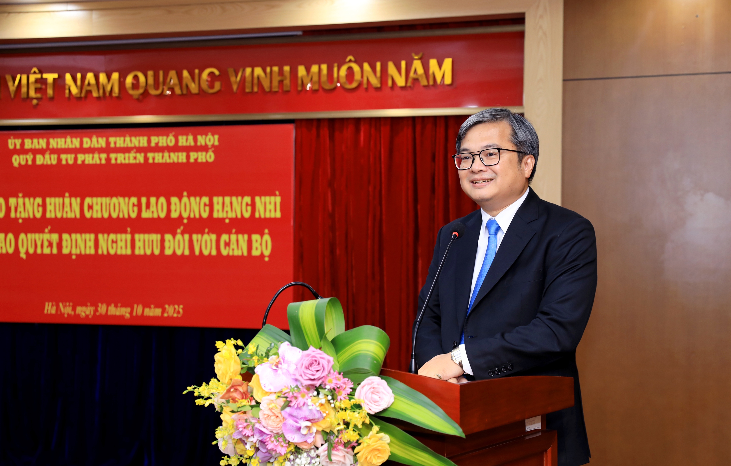 Tại buổi lễ, thừa uỷ quyền của Chủ tịch nước, Phó Chủ tịch UBND Thành phố Trương Việt Dũng đã trao Huân chương Lao động hạng Nhì tặng đồng chí Chu Nguyên Thành - Tổng Giám đốc Quỹ đầu tư phát triển Thành phố.